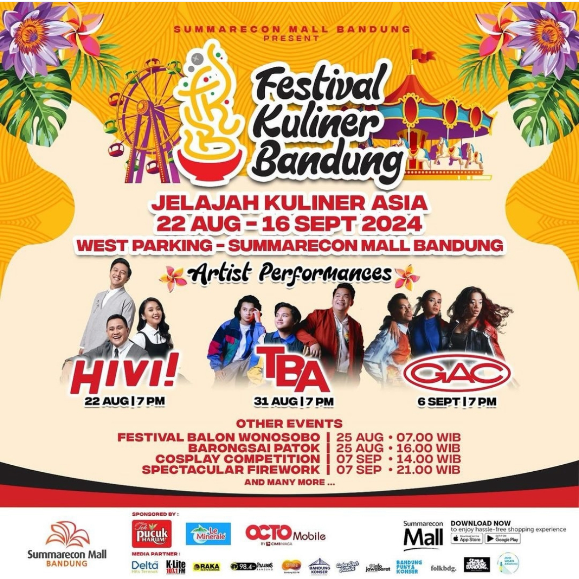 Wargi! Mari sambut Festival Kuliner Bandung pertama di Summarecon Mall Bandung! Dengan tema Jelajah Kuliner Asia dari 5 negara, nikmati lebih dari 400+ menu kuliner Asia! Acara ini juga akan dimeriahkan oleh special artist performance, wahana pasar malam, festival balon udara wonosobo, barongsai world championship, cosplay competition, spectacular fireworks, yang akan menambahkan pengalamanmu semakin seru sambil kulineran!