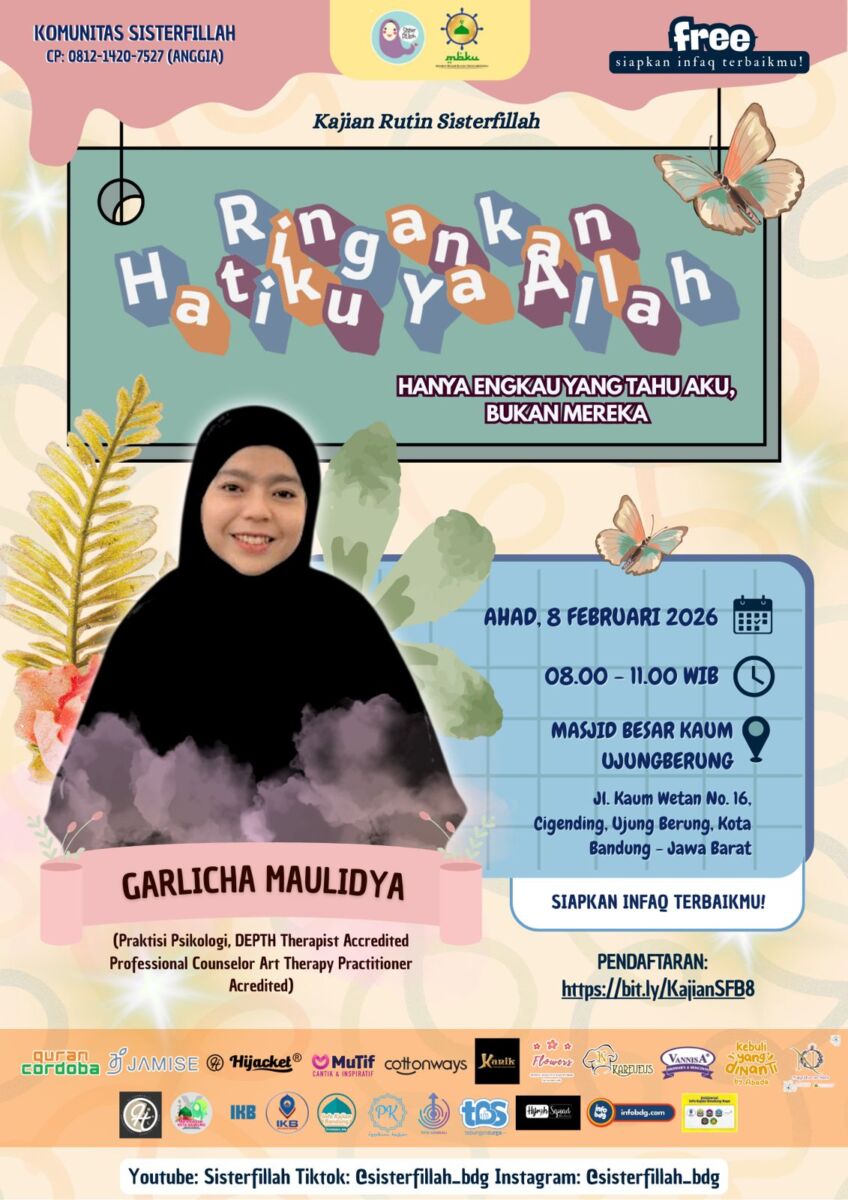 BANDUNG, infobdg.com – Komunitas Sisterfillah kembali menghadirkan Kajian Rutin Sisterfillah dengan tema “Ringankan Hatiku ya Allah” dan subtema “Hanya Engkau yang Tahu Aku, Bukan Mereka.” Kajian ini dirancang sebagai ruang refleksi dan penguatan diri bagi para muslimah yang ingin belajar menenangkan hati, memahami luka batin, serta mendekatkan diri kepada Allah di tengah dinamika kehidupan sehari-hari.