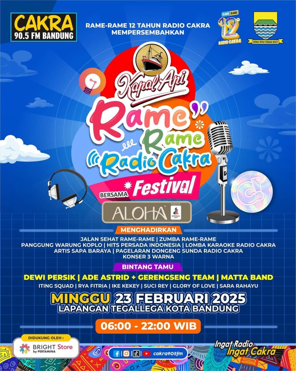 BANDUNG, infobdg.com – Dalam rangka merayakan 12 tahun Radio Cakra 90.5 FM, sebuah acara spektakuler bertajuk “Rame-Rame Radio Cakra Festival” akan digelar pada Minggu, 23 Februari 2025, di Lapangan Tegalega, Kota Bandung. Acara ini berlangsung sepanjang hari, mulai pukul 06.00 hingga 22.00 WIB, dan dipastikan akan menyuguhkan hiburan seru bagi seluruh warga Bandung.