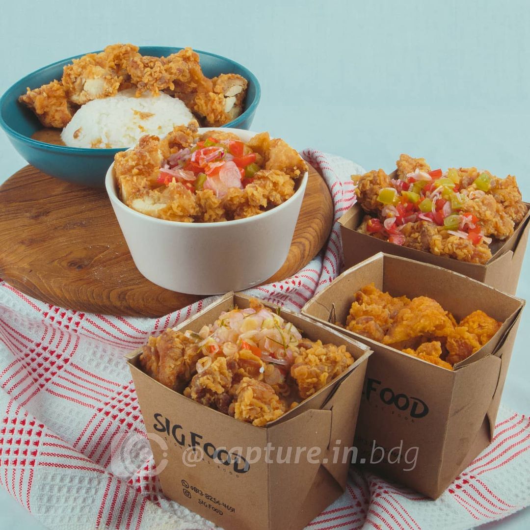 Sesuai dengan namanya, Sig Food menawarkan menu nasi ayam dengan tambahan aneka macam saus yang disajikan dalam box. Menu rekomendasinya adalah blackpepper chicken rice, matah chicken rice, salted egg chicken, dan dabu chicken rice.