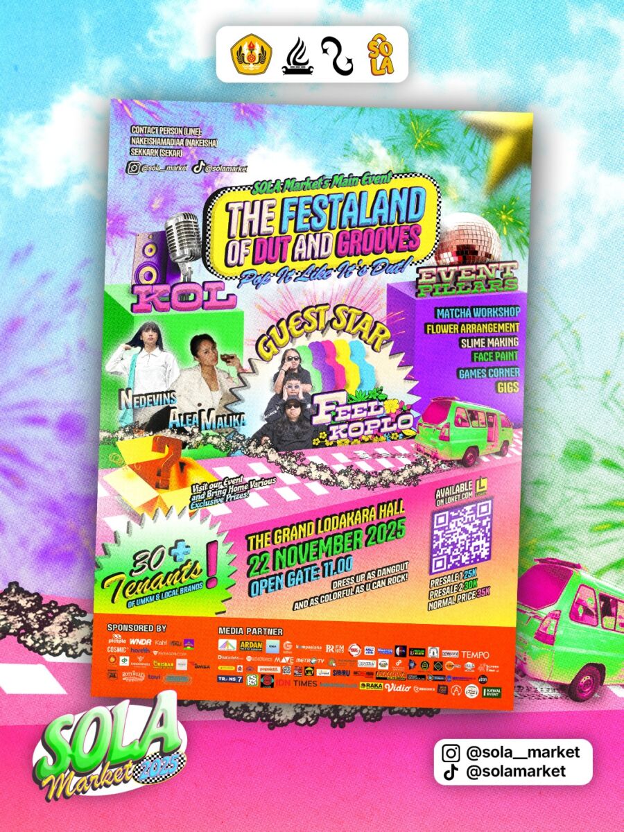 BANDUNG, infobdg.com – SOLA Market 2025 kembali hadir dengan konsep yang makin fresh dan penuh energi lewat tema “The Festaland of Dut and Grooves”. Tahun ini, event tahunan yang selalu dinanti ini ingin membawa pengunjung masuk ke dalam perayaan besar yang memadukan pop, dangdut, kreativitas, dan semangat anak muda dalam satu ruang yang penuh warna. Dengan tagline “Pop It Like It’s Dut!”, acara ini siap memberikan pengalaman paling groovy di penghujung tahun.
